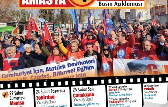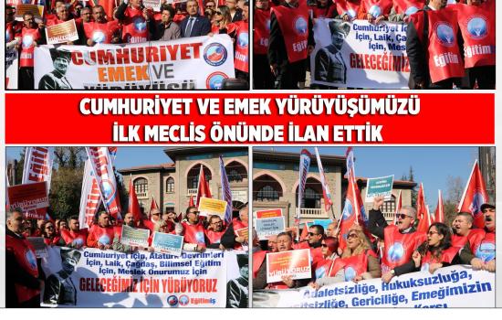 Eğitim-İş olarak emeğin sömürülmesine, eğitimin gericileştirilmesine, adaletsizliğe, liyakatsizliğe, hukuksuzluğa, eşitsizliğe, baskılara karşı Ankara’da 1. Türkiye Millet Meclisi binası önünde sesimizi yükselttik. Cumhuriyet için, Atatürk devrimleri için, emeğin onuru için, Cumhuriyet ve Emek Yürüyüşümüzü başlattığımızı ilan ettik.